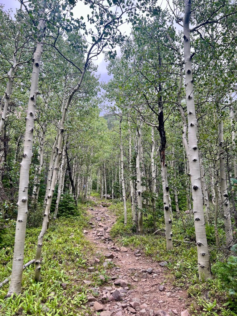 The first mile is rocky technical single track that leads you through aspen groves. The trail is in pristine shape. There is one small aspen across the trail, and it’s very easy to get over.